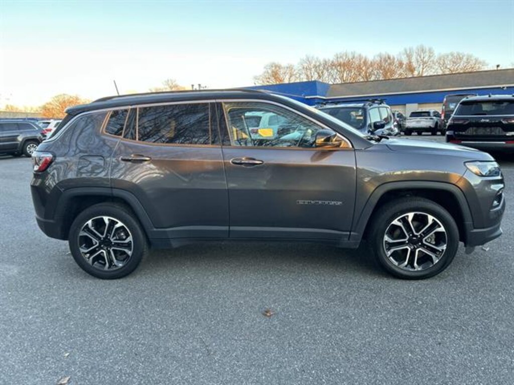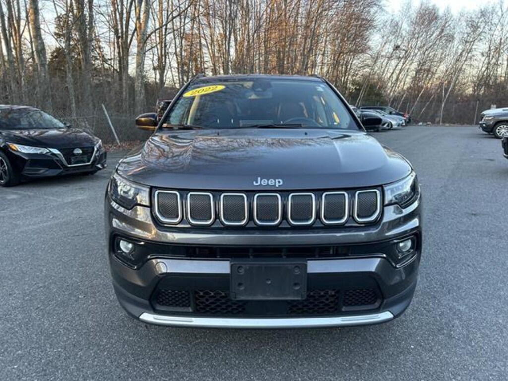 CARFAX One-Owner Upgrade your drive with this stylish gray 2022 Jeep Compass Limited 4x4 SUV. Powered by a responsive Tigershark 2.4L I4 engine and a smooth 9-speed shiftable automatic transmission, this Compass delivers a confident and comfortable ride in any weather. Enjoy advanced features like Adaptive Cruise Control, Lane Keeping Assist, Blind Spot Monitoring, and Front Automatic Emergency Braking for peace of mind on the road. Stay connected with the Uconnect infotainment system, featuring a 10.1-inch touchscreen, wireless Apple CarPlay/Android Auto, SiriusXM satellite radio, and built-in Wi-Fi hotspot. Experience luxury with leather-trimmed seats, a heated steering wheel, heated front seats, and dual-zone automatic climate control. Convenience features include remote engine start, proximity keyless entry, power liftgate, and a rearview camera. Chrome roof rails and LED headlights add a touch of sophistication, while 4x4 capability ensures you're ready for adventure. This Compass is the perfect blend of versatility, safety, and modern technology-ready for your next journey! Chrysler Jeep Dodge Ram 24 is your one-stop-shop for all your automotive needs so don't hesitate; Call us now and ask to speak with one of our fully certified and customer-friendly Sales or Service Consultants. From there, you will be able to schedule a test drive, Brake job or Oil Change of any of our 11 locations. We have New and Pre-Owned vehicles on the lot! Customer First Award for Excellence CJDR 24 is committed to offering our Brockton customers with the highest level of customer service, which is why we are thrilled to be a honored recipient of the FCA Customer First Award for Excellence. This prestigious award is designated for only those dealerships exemplifying extraordinary care and dedication to their customers, in five key areas of performance: Give us the opportunity to show you. Call or visit us today.