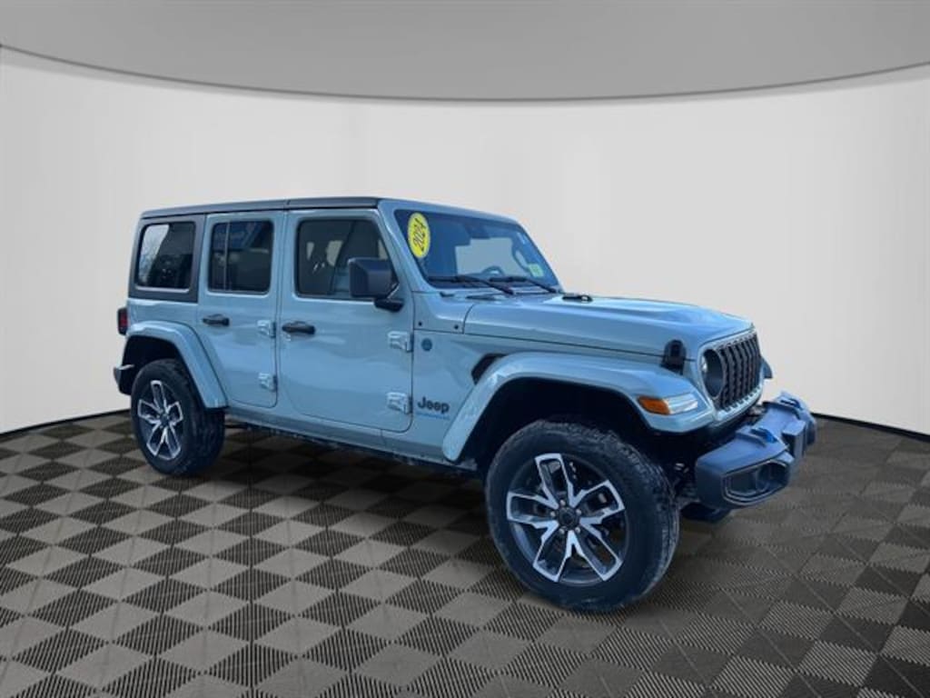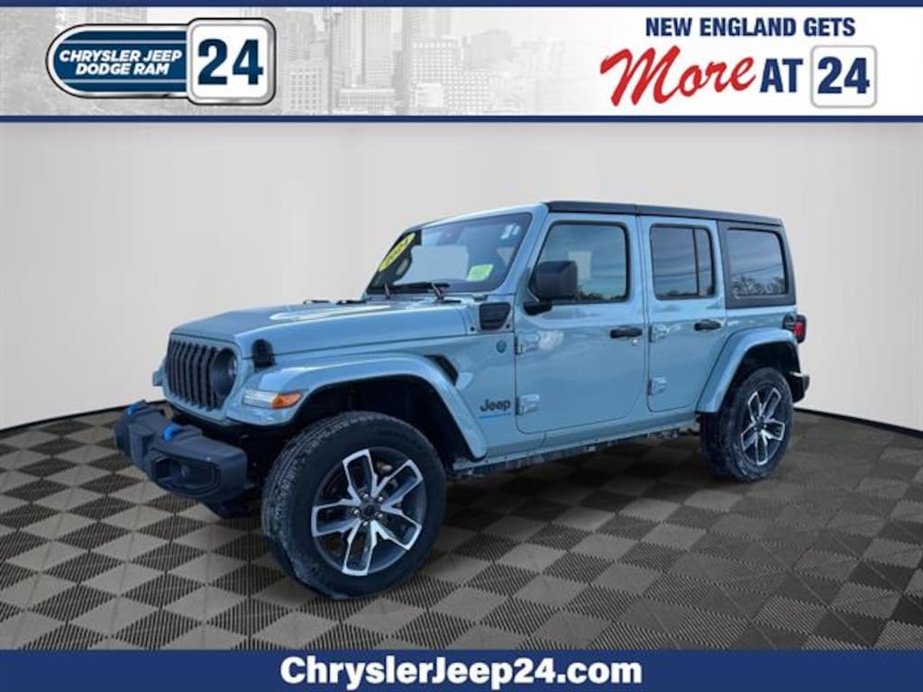CERTIFIED!! Clean CARFAX CARFAX One-OwnerBlack 3-Piece Hard Top, Heated Seats Steering Wheel. Remote Start! Apple Car Play Android Auto! Discover the adventure-ready 2024 Jeep Wrangler Unlimited 4x4 Sport S 4xe in stunning Lt. Blue. This plug-in hybrid SUV offers legendary off-road capability with part-time 4WD and a 2.0L Plug-in Hybrid Turbo engine delivering 375hp. Enjoy up to 21 miles of pure electric driving and quick charging options with a 7.2 KW onboard charger and SAE J1772 connector. Inside, stay connected with a 12.3-inch Uconnect infotainment touchscreen, wireless Apple CarPlay/Android Auto, and Wi-Fi hotspot. Safety is paramount with adaptive cruise control, front automatic emergency braking, rearview camera, and advanced driver assistance features. The Black 3-piece hard top adds versatility, while features like push-button start, automatic climate control, heated mirrors, and customizable digital instrument cluster enhance comfort. With rugged sport-tuned suspension, front/rear tow hooks, and removable soft top, this Wrangler 4xe is built for both city life and the trail. Test drive today and experience Jeep's iconic style with modern efficiency. Low miles! 5,686 Miles Below Average Chrysler Jeep Dodge Ram 24 is your one-stop-shop for all your automotive needs so don't hesitate; Call us now and ask to speak with one of our fully certified and customer-friendly Sales or Service Consultants. From there, you will be able to schedule a test drive, Brake job or Oil Change of any of our 11 locations. We have New and Pre-Owned vehicles on the lot! Customer First Award for Excellence CJDR 24 is committed to offering our Brockton customers with the highest level of customer service, which is why we are thrilled to be a honored recipient of the FCA Customer First Award for Excellence. This prestigious award is designated for only those dealerships exemplifying extraordinary care and dedication to their customers, in five key areas of performance: Give us the opportunity to show you. Call or visit us today.Certified Pre-Owned